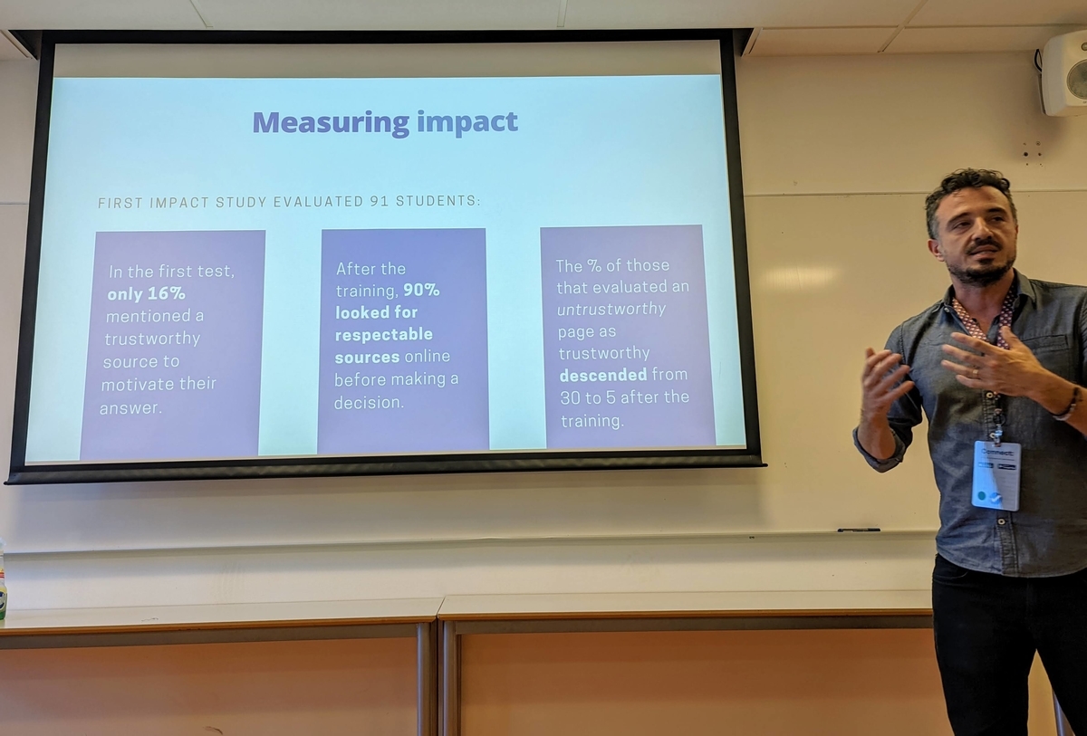 スペインのファクトチェック団体「Newtral」からは自分たちで開発したClaim Hunterというツールの紹介がありました。政治家の発言を文字起こしし、検証対象となる主張を抜き出すことが可能で、60分間の演説を書き起こし、検証対象の発言を抽出するのに数秒しかかからないため、作業時間が90%短くなったそうです。