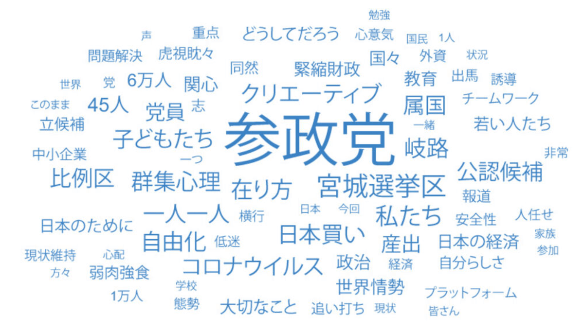 最近は日本のメディアでもワードクラウドを活用するケースが増えています。先日の参議院議員選挙でも、候補者や現職議員の行った演説の内容をワードクラウドで表現する記事が数多く見られました。たとえば河北新報オンラインニュースでは、公示日における宮城選挙区の候補者の演説内容をワードクラウドで表現しています。