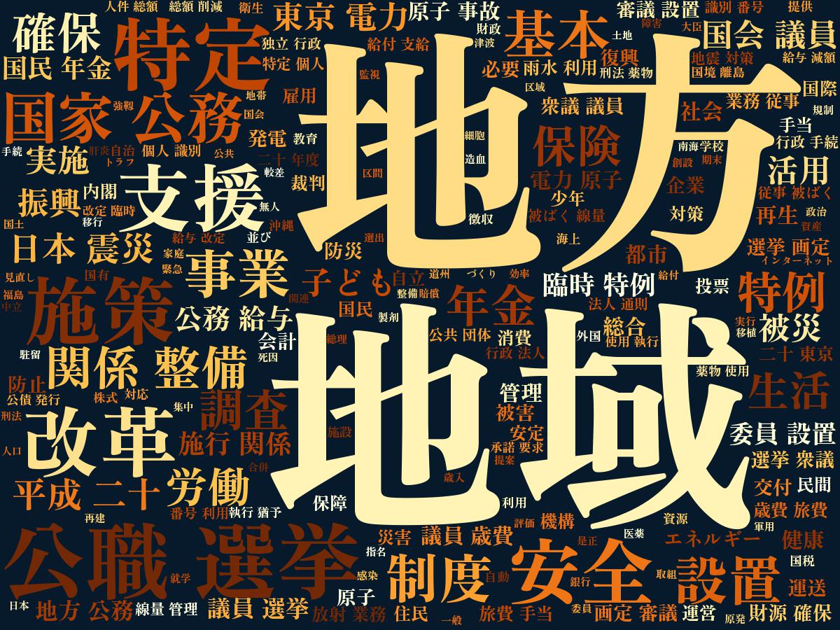 東日本大震災の直後ですが「震災」「被災」といった語は比較的小さく、「地方」「地域」などの単語が多いようです。震災直後に成立した「国民生活等の混乱を回避するための地方税法の一部を改正する法律案」のように、震災による影響を考慮した特例措置などを定める法案が多かったためと思われます。